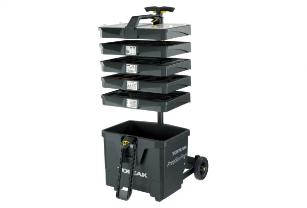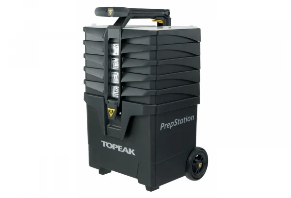 La boite à outils PrepStation se déplace très facilement grâce à ses deux roues en 5″, et elle contient 6 compartiments.