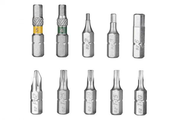 • Outils : Embouts Allen 2 / 3 / 6 mm – Embouts Allen 4 / 5 mm (longueur d’embout 30 mm) – Embouts Torx® T10 / T15 / T20 / T25 – 2 Embouts de tournevis Phillips