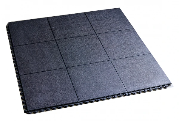 Dalle anti-fatigue noire 915x915mm, idéal pour améliorer l’ergonomie du travail en atelier. Son côté amortissant limite le risque de casse d’outil lors d’une chute.