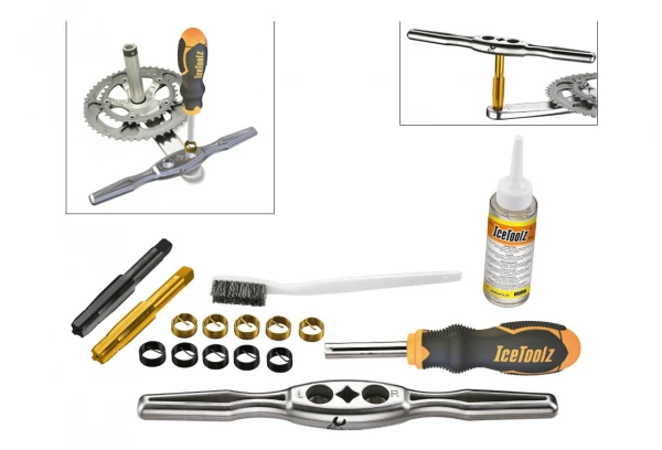 - Contiens filière tarauds et kit d’hélicoil pour réparer les filetages de manivelles abimés.