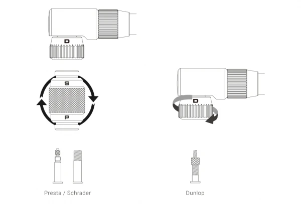 Doté d’un manomètre de 220 psi et d’une tête de valve filetée « Helix » compatible avec les valves Presta, Schrader et Dunlop.