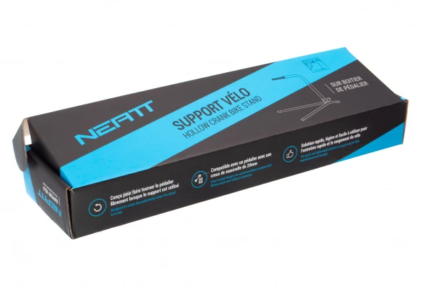 Le support vélo Neatt est une solution rapide, légère et facile à utiliser pour l’entretien et le rangement de votre vélo. Conçu pour faire tourner le pédalier librement lorsque le support est utilisé, il est uniquement compatible avec les boîtiers de pédalier creux de 20 mm.